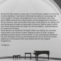 Musical Art that adapts to every type of soul, the piano speaks no words yet is well understood. I was drawn to learning the piano at a young age. My parents bought a 120-year-old upright grand, and I took lessons for a few years. What I learned from those lessons was the playground of the keys. I did not, however, learn the notes; they never made sense to me. Being a kid and having gone through so many years of lessons I did not want to admit that I knew nothing about the notes. So I did not admit it. It wasn’t till I was about fifteen and close to quitting piano lessons, that my second teacher tricked me by putting a different piece of music with the wrong title in front of me and discovered that I wasn’t playing by reading the notes, I was playing from memory. I quit the lessons but never quit playing the piano. Out of my imagination began to make up my own music. Music became an expression of myself, what I was feeling. It’s now been over twenty years since lessons ended. I detest playing in front of crowds and get stage fright easily, but I want to share the gift God gave me, which is why I force myself to donate time in the hospital lobby on the shiny grand piano. Playing the piano is what I imagine painting a beautiful picture must feel like. It is art, and playing is therapy to my soul. My desire is that you will be blessed by this art and that it would inspire you to find peace within your bodies and stir your magical imaginations.